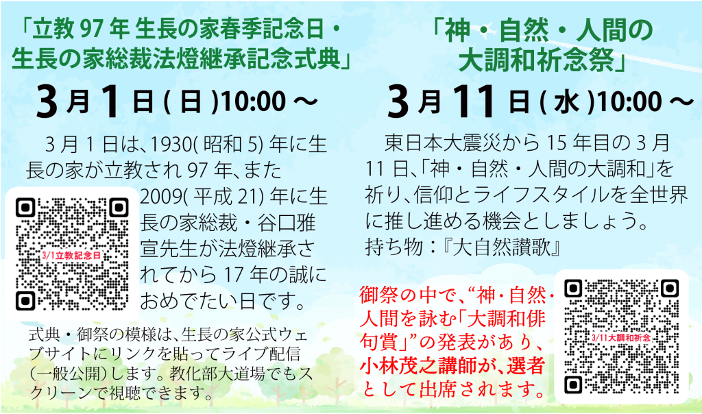 お知らせ 今後の主な行事予定 他の行事は「行事日程」をご覧ください。 【Facebookに登録していないと視聴できない可能性があります】 お知らせ & ニュース 202603月号 明るく笑って生きる 第27回(2/21)「生長の家オープン食堂」開催! 202602月号 御心を成就する 第26回(12/21)「生長の家オープン食堂」開催! 202601月号 元に帰る 202512月号 禊祓いですべてを浄めて 202511月号 自然と神様に感謝する祭り お知らせ & ニュースを見る 各種コンテンツ 白鳩会 女性の組織で、会員相互の修養・研さんを図りながら、生長の家の教えを実践しています。 相愛会 男性の組織で、会員相互の修養・研さんを図りながら、生長の家の教えを実践しています。 青年会 12歳以上、40歳未満の男女で構成される組織です。 栄える会 産業人の組織。各支部で例会を定期的に開催しています。 生教会 教職員の組織、親子で真理を学べる生命学園を開催。 講師会 光明実践委員と地方講師の資格を持つ男女の組織です。 リンク 工事中